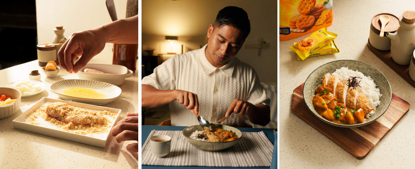 Place cooked rice on a plate, top with air-fried chicken katsu slices. Pour curry sauce over the chicken and rice and garnish on top. Serve hot.