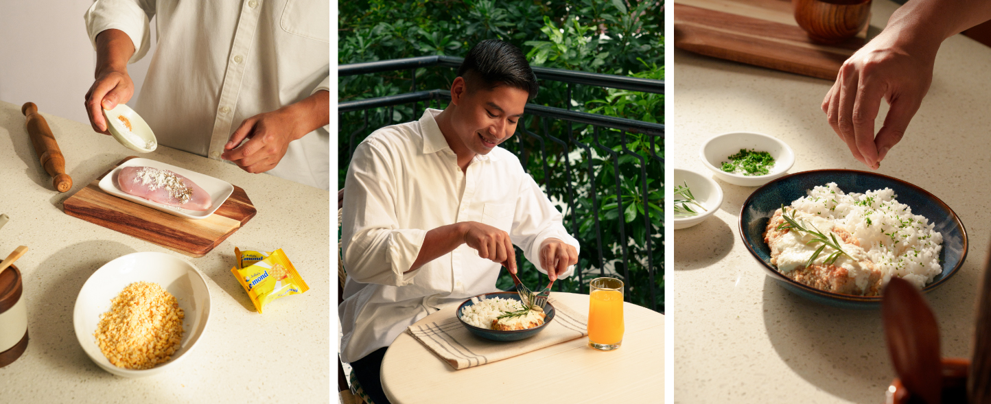 Place cooked rice on a plate. Slice air-fried chicken and place on top or next to rice. Pour creamy lemon sauce over chicken (and a little over rice). Garnish with Rosemary.