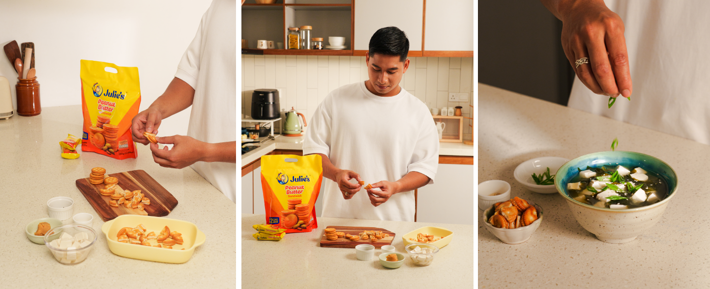 Pour the miso soup into a bowl. Top with toasted peanut butter biscuit croutons and sliced green onions.